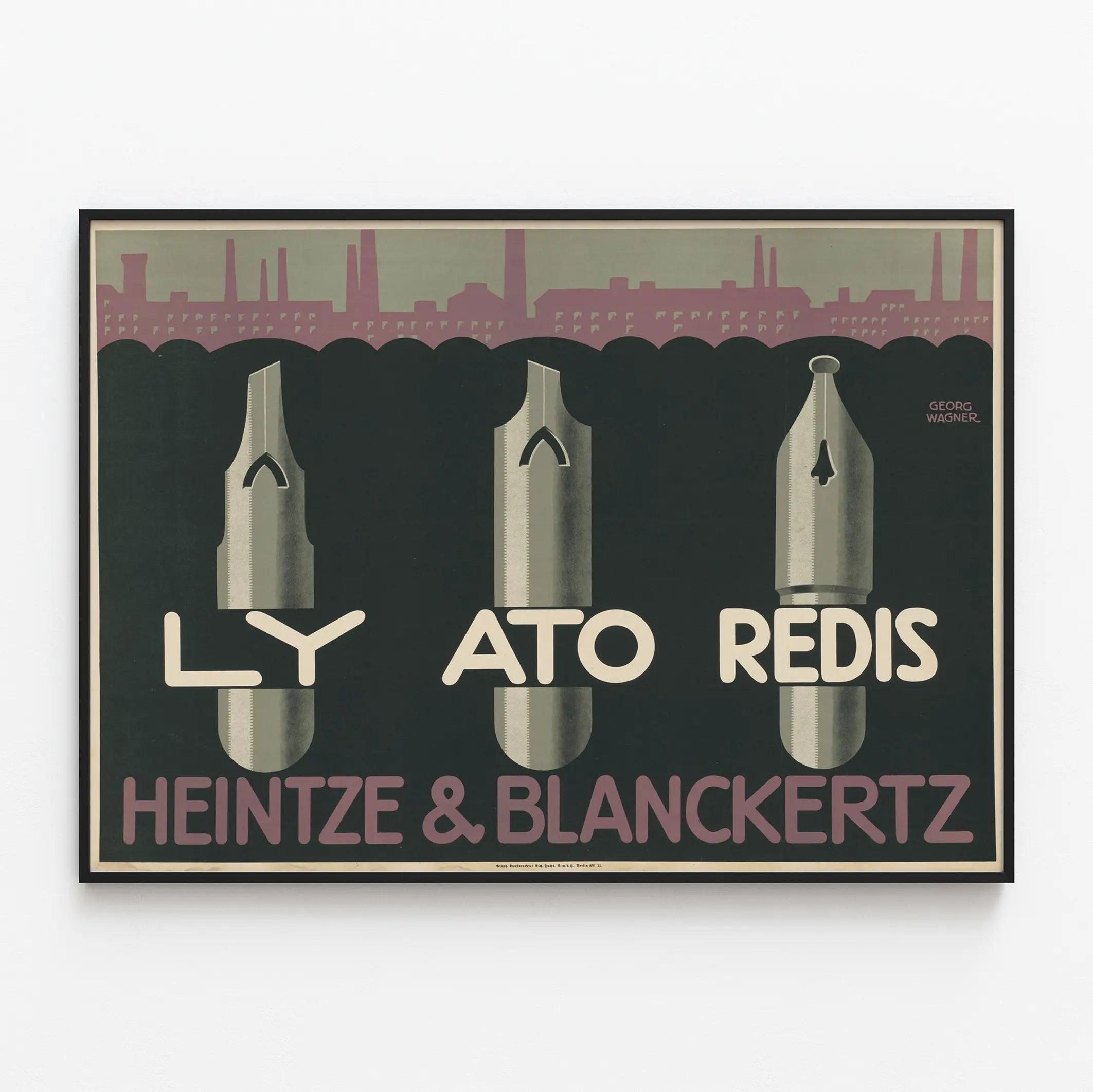 Deze vintage poster toont drie gestileerde schrijfpennen op een donkere achtergrond, contrasterend met een industriële silhouet op de achtergrond. De poster toont de namen LY, ATO, REDIS, verbonden aan het merk Heintze & Blanckertz, een gerenommeerde fabrikant van schrijfpennen. Het grafisch ontwerp is gebaseerd op eenvoudige geometrische vormen en een subtiel kleurenpalet, gedomineerd door zwart, grijs en een zachte paarse tint. Ideaal als muurdecoratie, deze poster roept nostalgie op naar traditionele schrijfinstrumenten en voegt een retro- en industriële sfeer toe aan moderne interieurs. Perfect voor liefhebbers van typografie, kalligrafie of gewoon vintage grafische kunst, verrijkt dit decoratief stuk de ruimte en muur met een vleugje ambachtelijke authenticiteit. Of het nu in een kantoor of woonkamer is, deze poster benadrukt de functionele schoonheid van een oud object dat symbool staat voor creativiteit en vakmanschap.