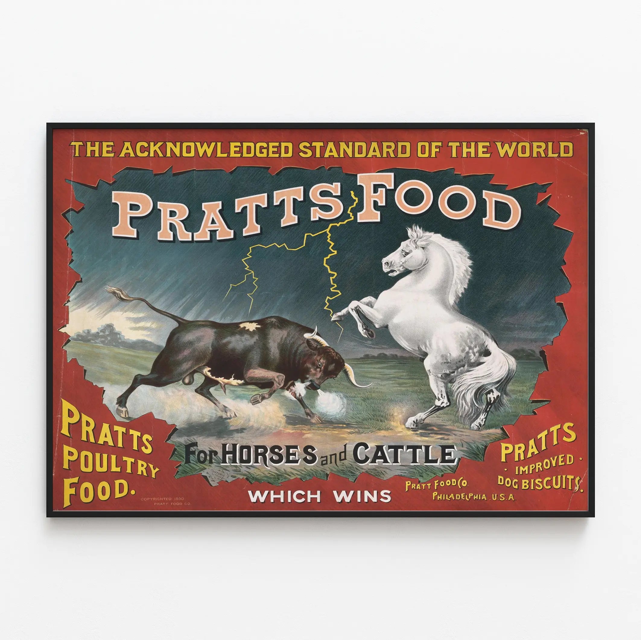 Deze vintage reclameposter toont "Pratts Food", een voer voor paarden en vee, benadrukt door twee krachtige dieren: een zwarte stier in aanvalshouding en een wit paard dat zich op de achterbenen heeft gezet tegenover hem. De dramatische achtergrond, met bliksemschichten en onstuimige hemel, geeft een intense sfeer aan deze muurdecoratie. De tekst in gouden letters op een rode achtergrond benadrukt het merk en de aanvullende producten, waaronder pluimveevoeder en hondenkoekjes. Deze oude stijl affiche roept de dynamiek en kwaliteit op die geassocieerd worden met "Pratts Food", en onderstreept haar reputatie als "de erkende norm in de wereld". Ze vormt een uitstekende muurdecoratie voor liefhebbers van historische reclameposters of voor een rustieke, landelijke sfeer. Het visuele contrast tussen de levendige kleuren van de rode lijst en de gedetailleerde tekening van de dieren trekt de aandacht en geeft deze decoratieve stuk een eigen identiteit. Deze poster nodigt uit om een tijd te ontdekken waarin affiches een krachtig communicatiemiddel waren voor landbouwproducten en diervoeder. Dankzij het verzorgde grafisch ontwerp en de impactvolle lay-out is deze muurdecoratie ideaal om met karakter een keuken, kantoor of professionele ruimte gerelateerd aan de veeteelt of de dierenwereld te verfraaien. Ze is perfect om een retro-elegante toets toe te voegen en tegelijkertijd een verhaal te vertellen over de voedingsnormen van vroeger.