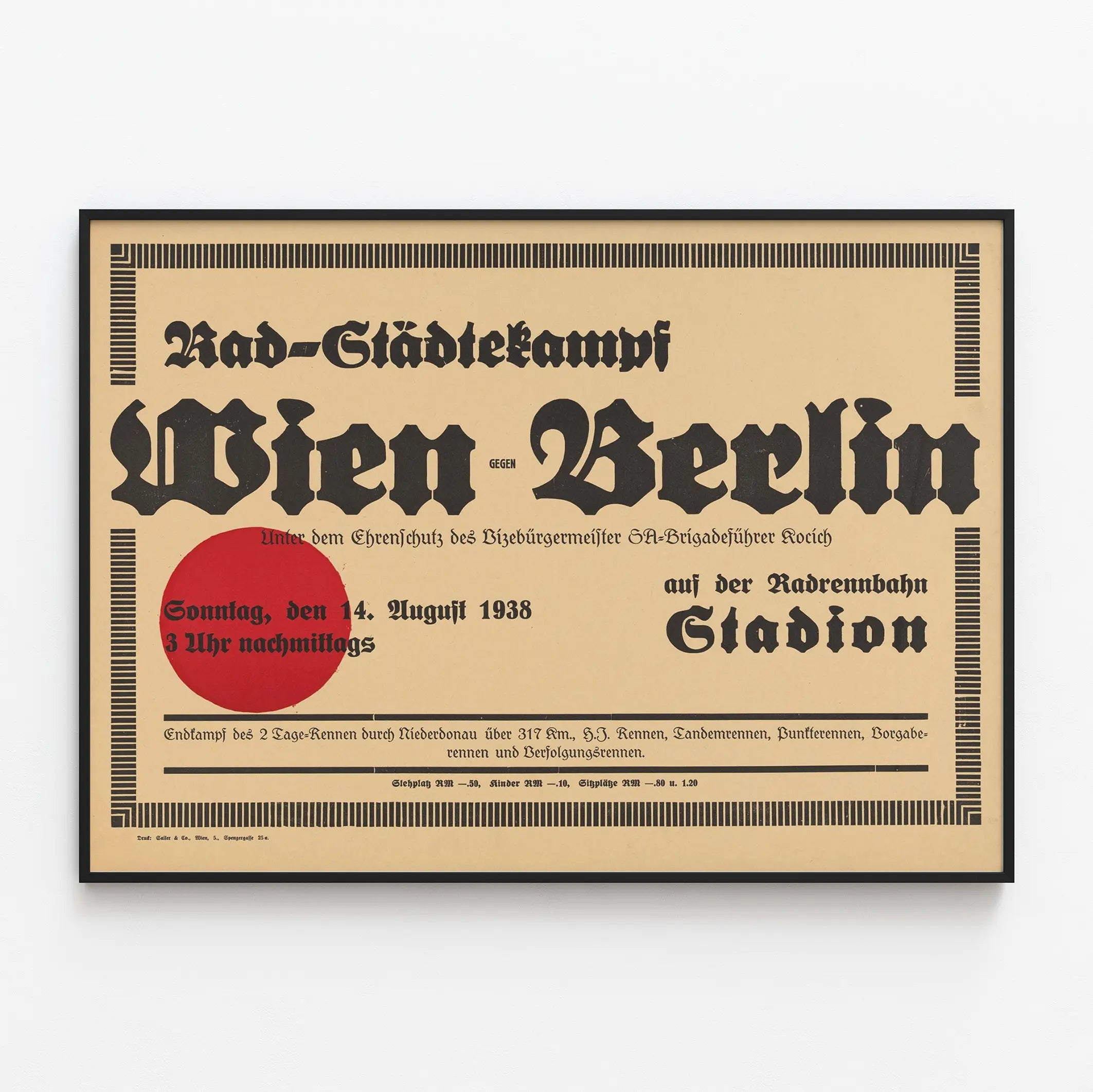 Deze vintage affiche getiteld « Rad-Stadtekampf Wien gegen Berlin » legt een historisch sportevenement vast, een wielerwedstrijd tussen de steden Wenen en Berlijn uit 14 augustus 1938. Deze poster vormt een originele en iconische muurdecoratie voor liefhebbers van geschiedenis, sport en grafisch ontwerp uit het begin van de twintigste eeuw. Met zijn beige achtergrond en zwarte gotische typografie straalt dit typografische kunstwerk een opvallende retrostijl uit die gemakkelijk te herkennen is.