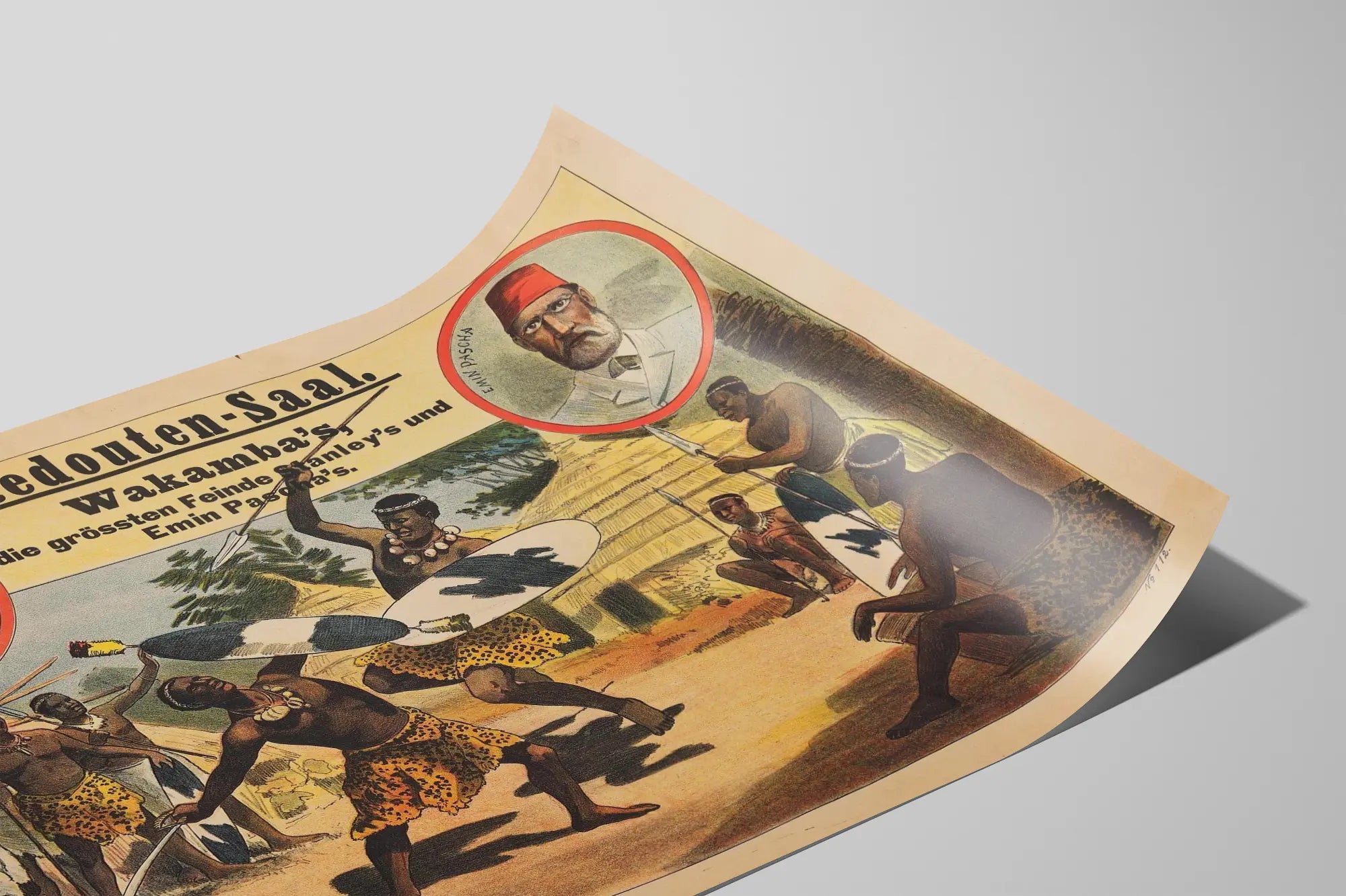 Breng een vleugje geschiedenis in uw interieur met dit vintage affiche getiteld « Redouten-Saal Wakambas », een uitzonderlijke poster die een confrontatiemoment tussen de groepen Wakamba en de historische figuren Stanley en Emin Pacha afbeeldt. Deze wanddecoratie onderscheidt zich door zijn oude esthetiek en zijn grafische stijl, typerend voor affiches uit de negentiende eeuw, ideaal voor liefhebbers van geschiedenis en cultuur.