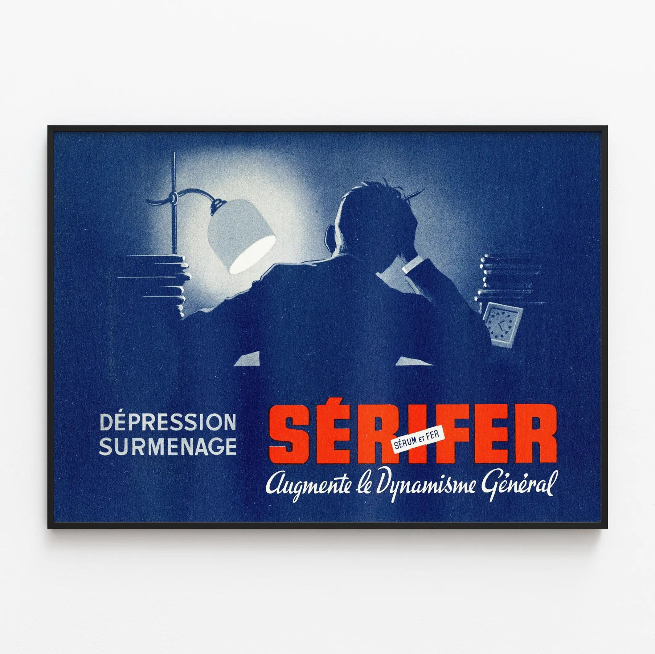 Ontdek dit vintage affiche vol karakter, perfect voor een originele wanddecoratie. Deze oude reclameposter toont een man van achteren, zittend aan een bureau verlicht door een lamp, wat vermoeidheid en overbelasting suggereert. De keuze voor donkerblauwe en helderrode kleuren creëert een opvallend contrast dat meteen de aandacht trekt. Deze poster benadrukt het product genaamd "Sérifer" – een mengsel van serum en ijzer, geprezen om het "verhogen van de algehele vitaliteit". De retro grafische stijl en de donkere sfeer van deze affiche brengen een vleugje elegantie en nostalgie in elke ruimte. Als wanddecoratie is dit vintage schilderij perfect voor een kantoor, woonkamer of werkruimte, en versterkt het een professionele en inspirerende sfeer. De pakkende tekst "Overbelasting Depressie" herinnert aan de kwesties rondom energie en vitaliteit, en biedt een opvallende blikvanger in interieurdecoratie. Dit strakke en esthetisch verfijnde poster vormt een unieke aanvulling op uw collectie wanddecoratie of kan dienen als eyecatcher in een retro- of industriële stijl. Ideaal voor wie waarde hecht aan decoratieve objecten met een verhaal of een sterke visuele identiteit, en kunst en boodschap wil combineren. Dit vintage wandpaneel is een uitstekende keuze om uw muren nieuw leven in te blazen en tegelijkertijd een vleugje authenticiteit en karakter aan uw interieur toe te voegen.