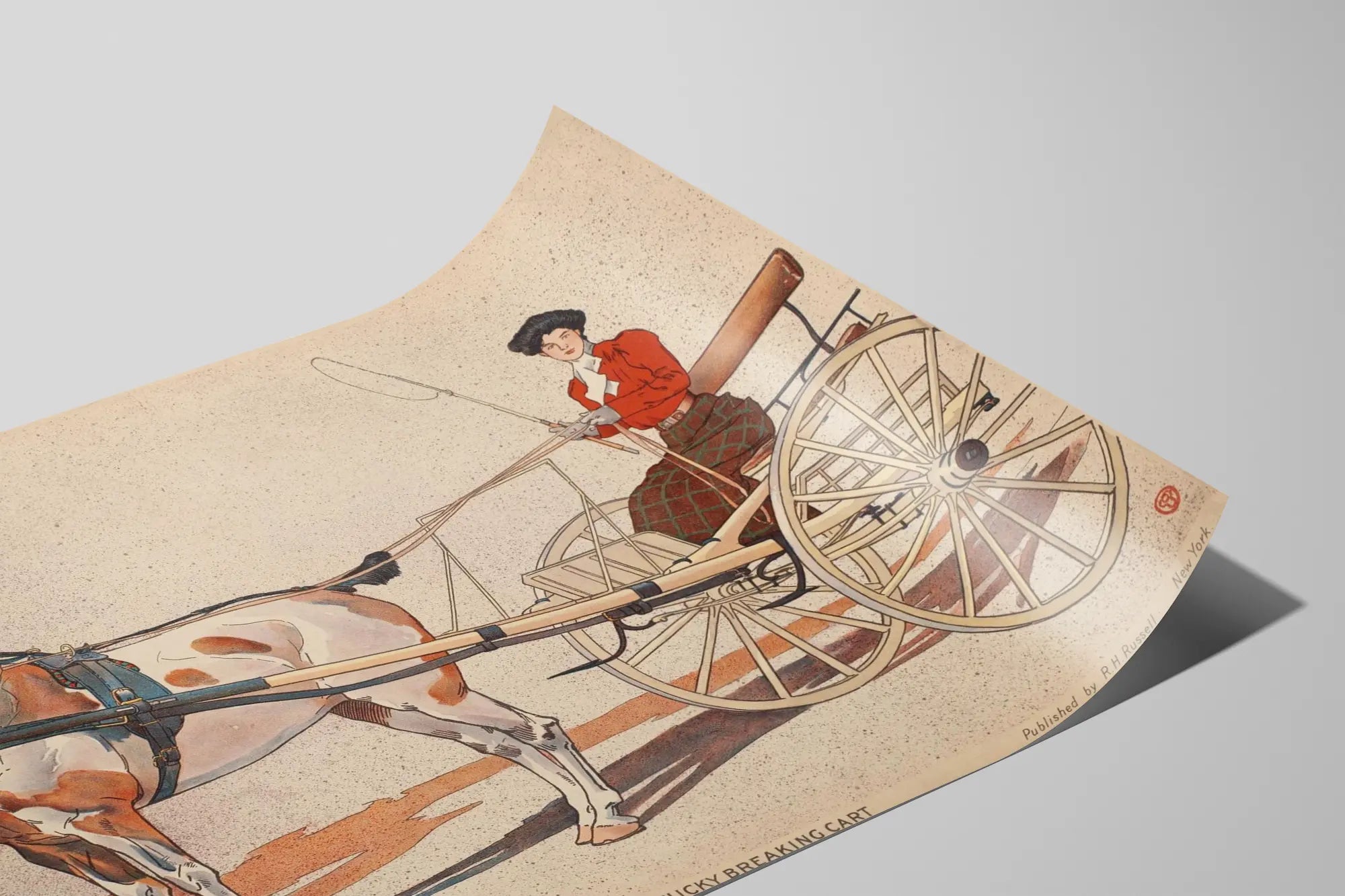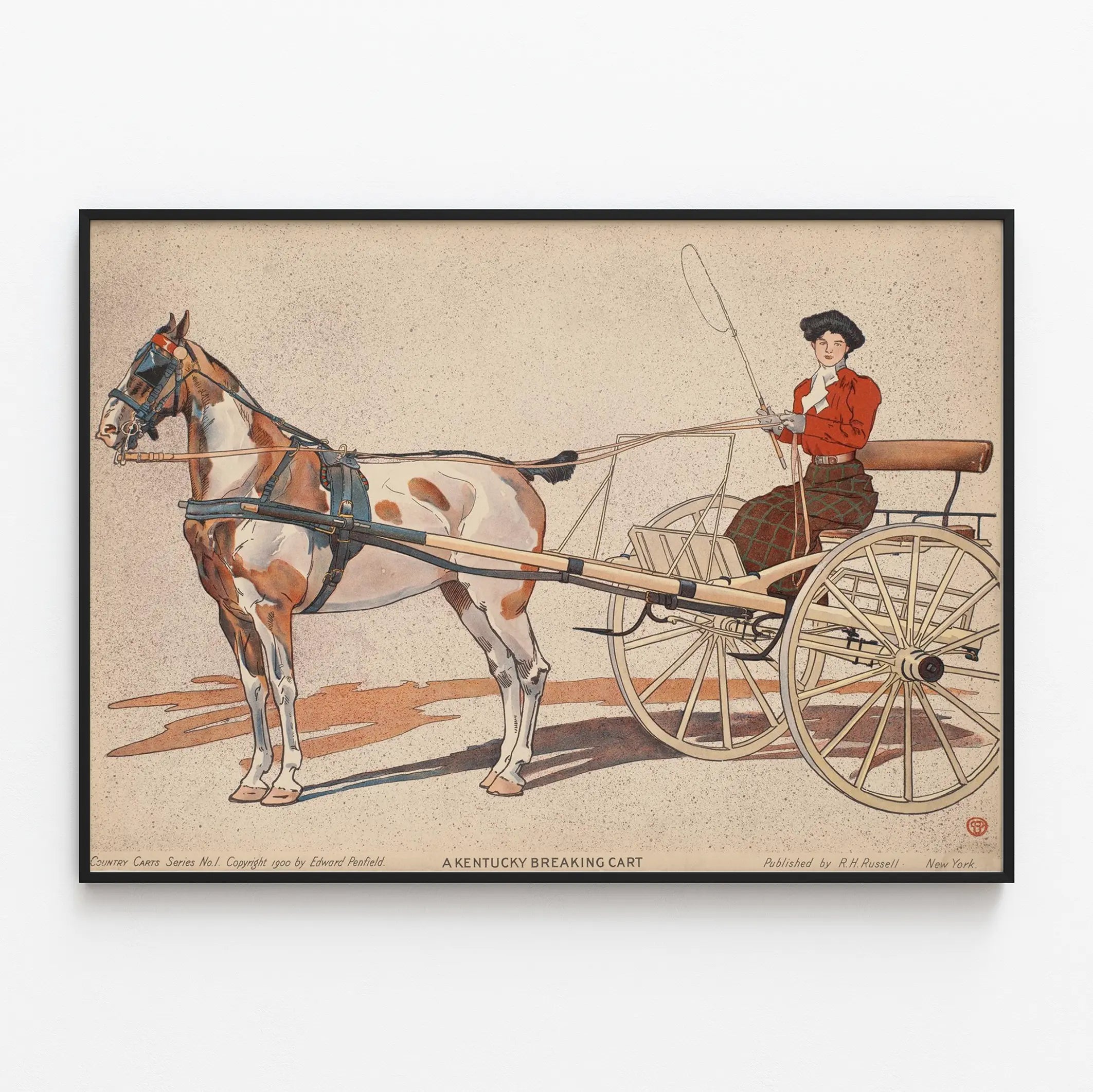 Ontdek dit elegante vintage affiche getiteld "A Kentucky Breaking Cart", een uniek wanddecoratiestuk dat eer betoont aan de kunst van het begin van de twintigste eeuw. Deze fijne en gedetailleerde illustratie toont een typische landelijke scène met een paard dat is aangespannen op een lichte wagen, bekend als "breaking cart" uit Kentucky. De verfijning van de lijntekening en het zachte kleurenpalet met accenten van bruin, beige en rood geven deze poster een authentieke en nostalgische charme.