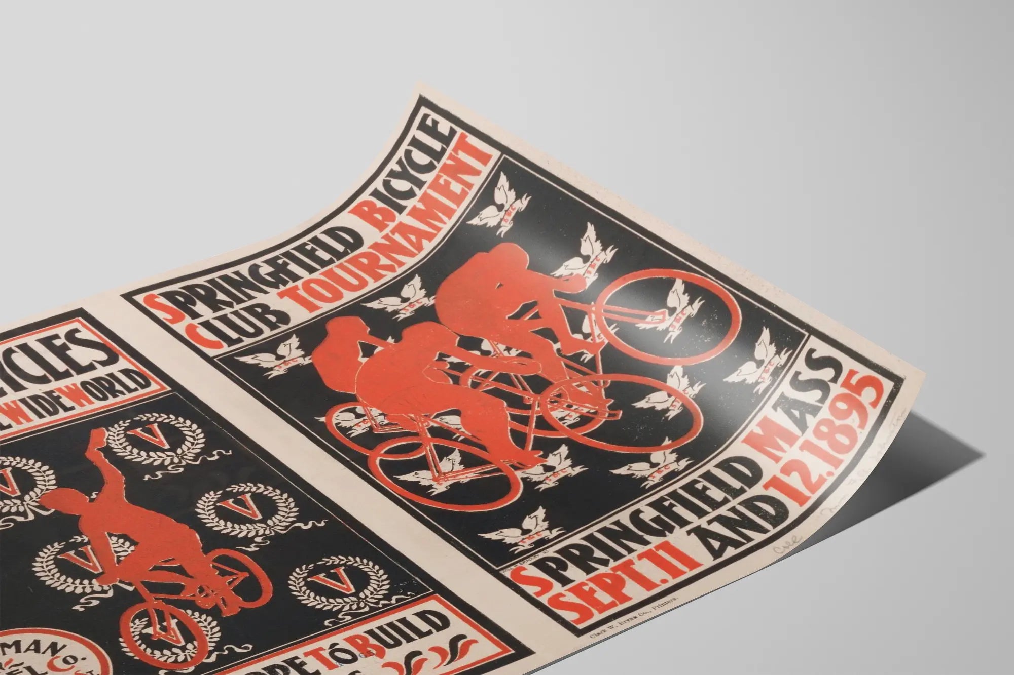 Deze vintage poster voor het Springfield Bicycle Club-toernooi toont een historische wielerwedstrijd uit 1895 in Springfield, Massachusetts. De wanddecoratie bestaat uit twee aparte en contrasterende panelen, voornamelijk in de kleuren zwart, rood en wit voor een retro en krachtige stijl. Het linker paneel benadrukt het merk "Victor Bicycles" met een rode silhouet van een wielrenner die zijn arm in overwinning omhoog houdt, omringd door lauwerkransen en het logo "Overman Wheel Co.", symbool van kwaliteit en exclusiviteit in de bouw van fietsen, zoals de slogan aangeeft: "Ze kosten meer om te maken dan alle andere". Het rechter paneel toont drie wielrenners in volle race, met rode silhouetten die zich aftekenen tegen een zwarte achtergrond met gestileerde adelaarmotieven die een dynamische en patriottische sfeer toevoegen. De inscriptie "Springfield Bicycle Club Tournament, 11 en 12 september 1895" geeft de context en datum van het toernooi weer. Deze poster is een echt decoratief object voor liefhebbers van wielrennen en oude kunst, dat een sportieve en historische sfeer brengt in elk interieur. Perfect geschikt als ingelijste affiche om een ruimte te verfraaien met een authentieke vintage uitstraling. Dankzij het evenwichtige grafisch ontwerp en het sobere maar contrasterende kleurenpalet straalt dit schilderij een nostalgische charme uit die liefhebbers van retro design en historische sportevenementen zal aanspreken.