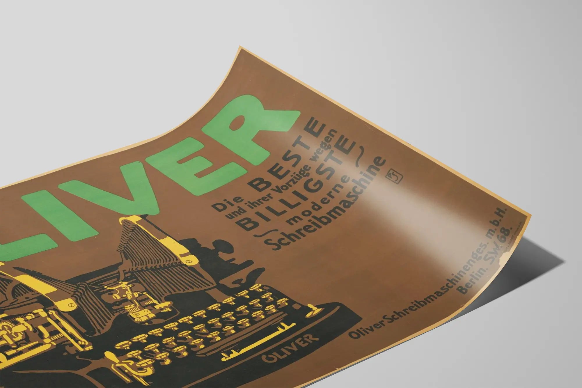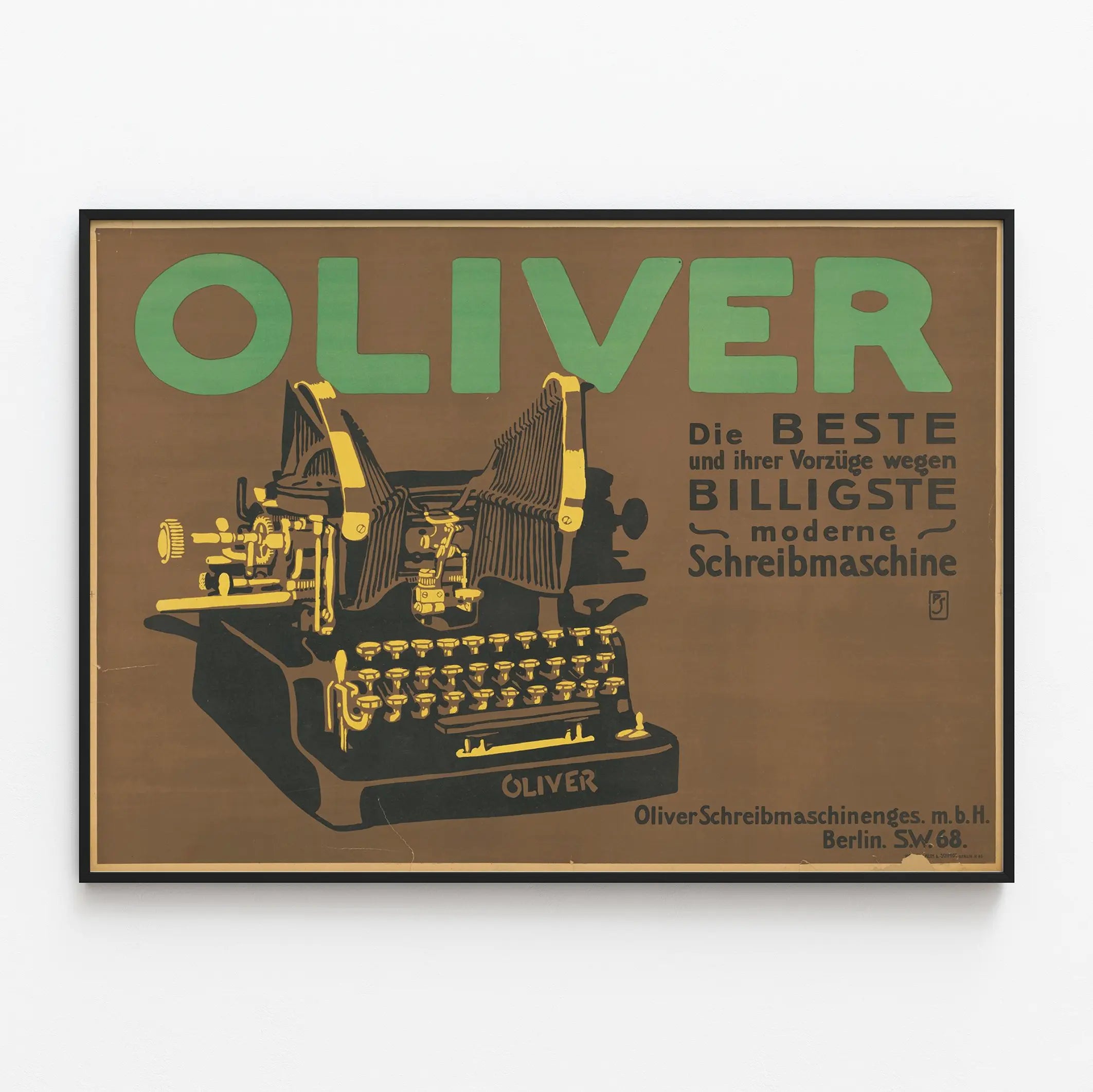 Deze vintageposter toont een OLIVER typemachine, verlicht met contrasterende tinten zwart, geel en groen op een bruine achtergrond. Het grafisch ontwerp benadrukt het product met een retrostijl, kenmerkend voor oude reclameborden. Het grote woord "OLIVER" in groen trekt onmiddellijk de aandacht en symboliseert het iconische merk van typemachines. De klassieke Duitse typografie vergezelt een gedetailleerde illustratie van de machine, die de technische kenmerken en mechanische uitstraling benadrukt. De inscriptie in het Duits geeft aan dat de OLIVER "de beste en goedkoopste" moderne typemachine is, waarmee de kwaliteiten en betaalbaarheid worden benadrukt. Deze poster is een uitstekende keuze voor muurdecoratie die de wereld van oude kantoren of technologische evolutie vóór het digitale tijdperk wil oproepen. De sobere grafische stijl en vintage kleuren maken het tot een ideaal decoratief element voor een industriële of retro sfeer, te plaatsen in een kantoor, bibliotheek of werkruimte. Dit klassieke en authentieke wandbeeld kan ook de liefhebbers van typografie en oude voorwerpen aanspreken, en een historische toets aan uw interieur geven. Kortom, deze OLIVER poster is een uitzonderlijk decorstuk dat esthetiek en industriële herinnering combineert om uw muren stijlvol te verfraaien.