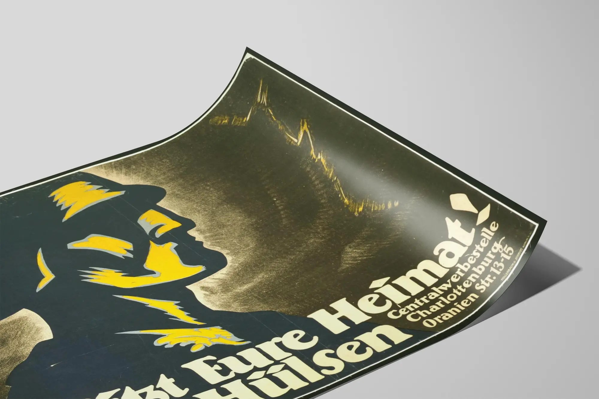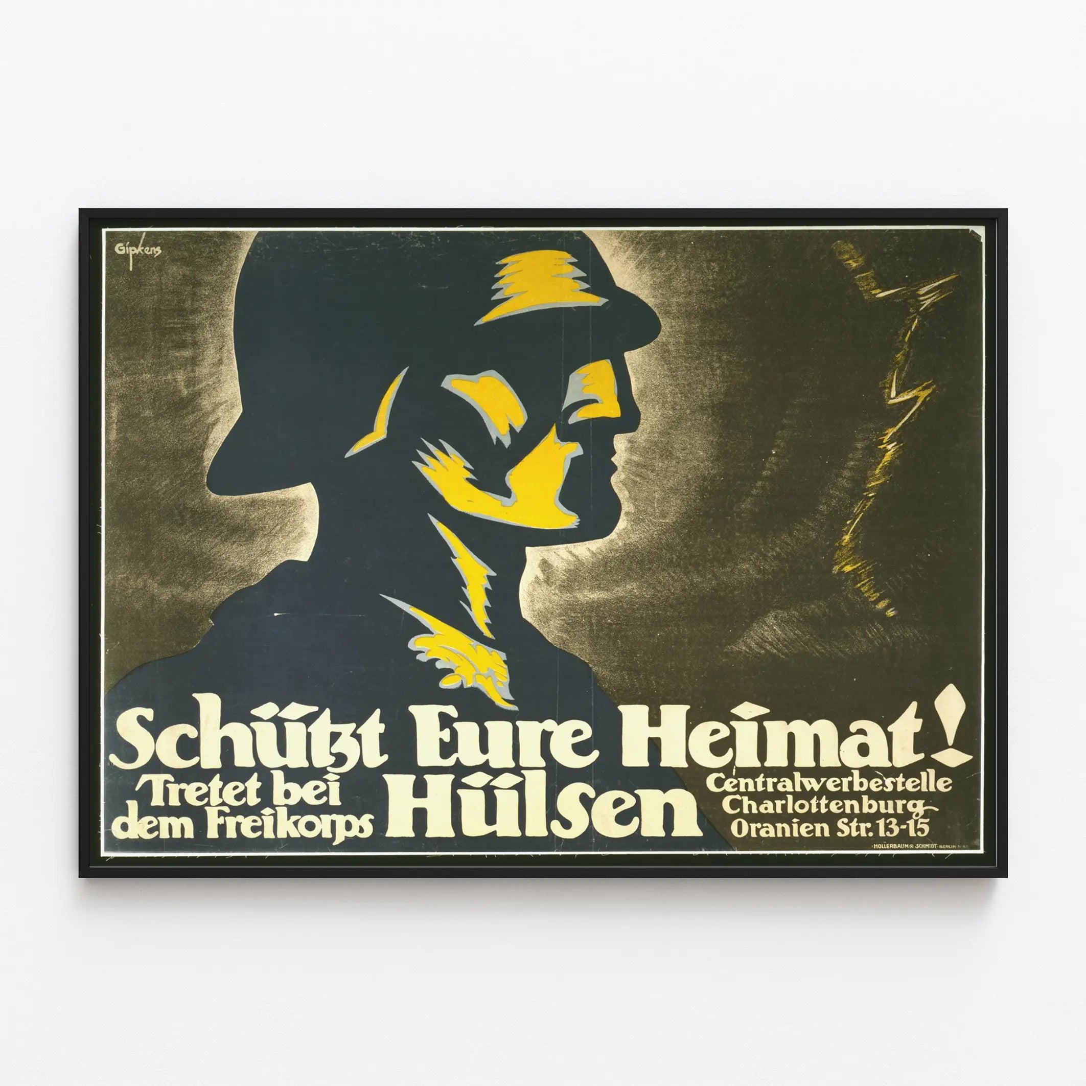 Ontdek deze vintage poster met een opvallende grafische stijl, gekenmerkt door een gestileerd silhouet van een soldaat met zwarte contouren en gele accenten, op een donkere achtergrond. Deze wanddecoratie uitdrukking geeft een krachtige boodschap weer, zichtbaar via de Duitse tekst "Schützt Eure Heimat! Tretet bei dem Freikorps Hülsen", die oproept tot het beschermen van het vaderland. Het werk toont een opvallende typografie en een strakke compositie die het gezicht van de militair met een helm benadrukt, en een sfeer van mobilisatie en betrokkenheid oproept.