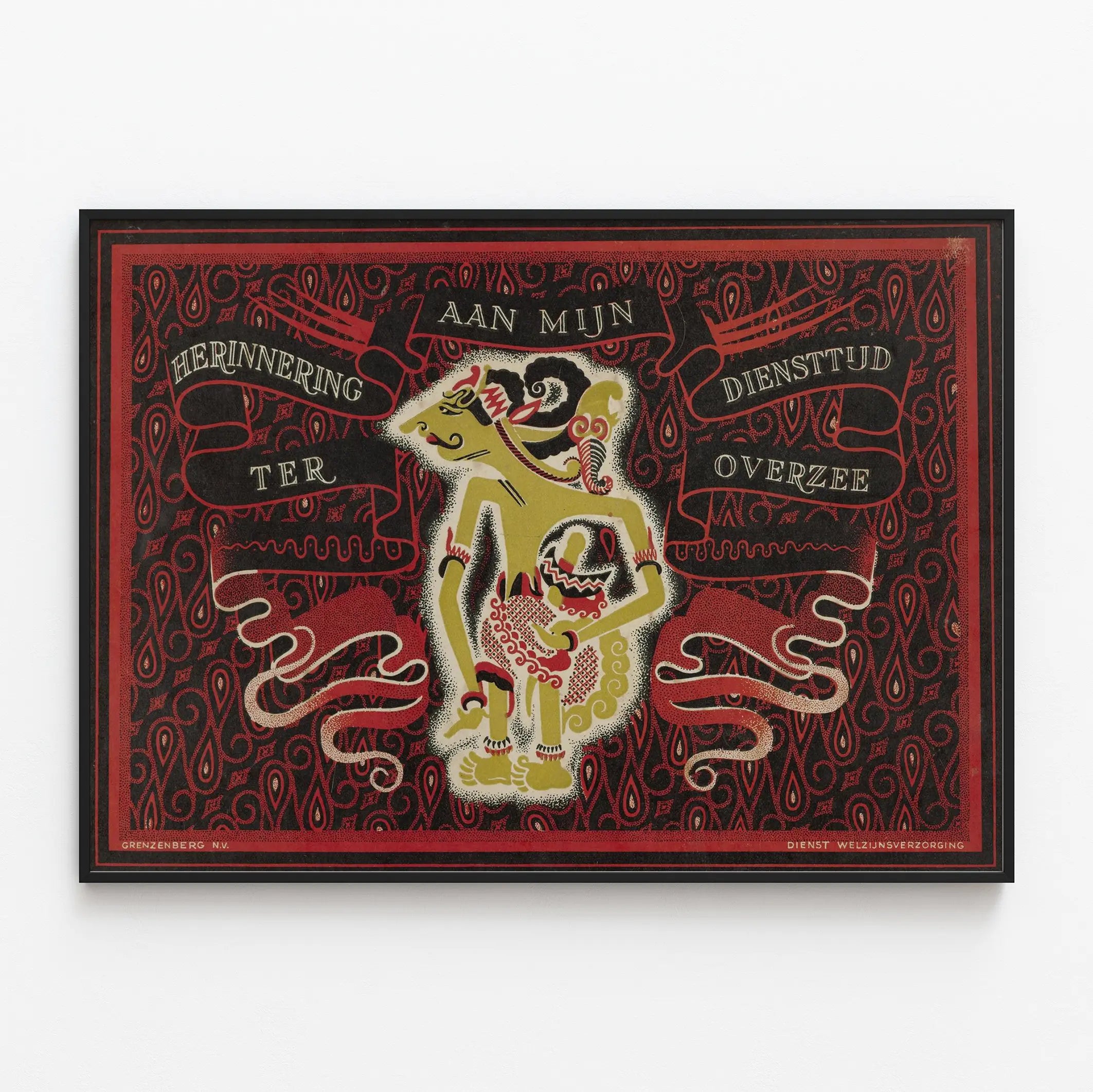 Deze vintage poster vormt een originele muurdecoratie, die grafisch ontwerp combineert met een persoonlijk aandenken. Hij draagt de Nederlandse tekst « Herinnering aan mijn diensttijd overzee », wat betekent « Herinnering aan mijn diensttijd in het buitenland ». Deze poster in rood-, zwart-, beige-tinten met enkele witte accenten toont een gestileerd personage in een grafische stijl die doet denken aan traditionele of volkskunst, omringd door complexe ornamentale motieven. Deze motieven, uitgevoerd in een warm en contrastrijk kleurenpalet, creëren een rijke en dynamische omlijsting die de aandacht van nature trekt.