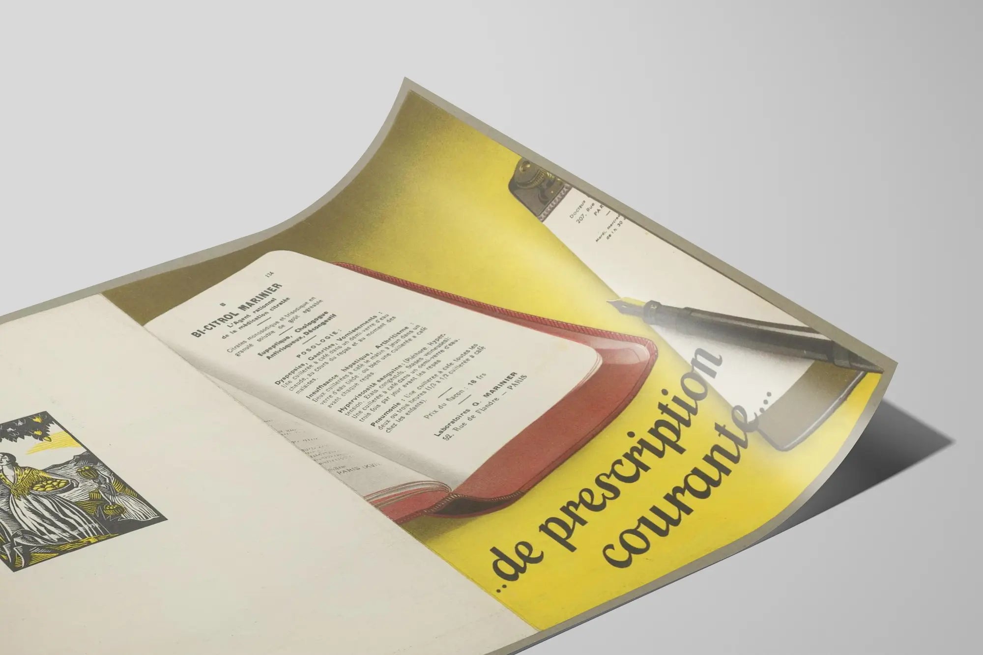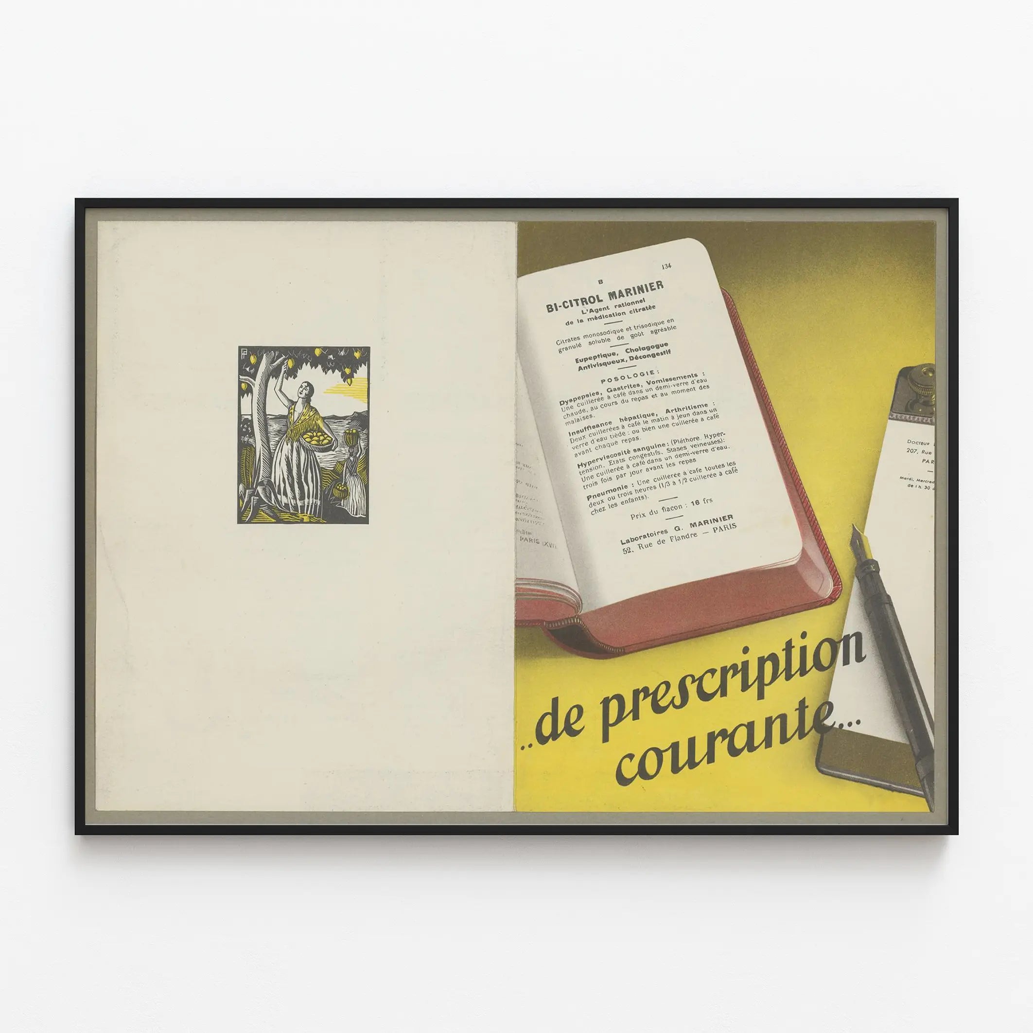 Ontdek dit vintage affiche dat het medicijn Bi-Citrol Marinier benadrukt, een oplosbare korrel op basis van monosodiumcitraat en trisodiumcitraat, gepresenteerd als een rationeel middel voor gecitraatiseerde medicatie. Deze historische wanddecoratie toont een geopend handboek met een gedetailleerde dosering, vergezeld van een vulpen en een medisch zegel, op een heldergele achtergrond die dynamiek en warmte aan het geheel toevoegt. Perfect voor liefhebbers van retro wanddecoratie of verzamelaars van medische reclameposters uit het midden van de twintigste eeuw, dit stuk beschikt over een elegante typografie en een authentiek ontwerp. Als een gebruikelijke voorschriftposter brengt het een sfeer die zowel historisch als grafisch is, perfect voor uw interieur. Deze reclameplaat, met suggesties voor anti-epileptische, galwegbevorderende, antivirale en decongestieve effecten, kan dienen als blikvanger in een consultatieruimte, een artsenkamer of een kamer gewijd aan vintage stijl. Zijn sobere en strakke stijl, met heldere tekst en grafische elementen, maakt het ook tot een decoratief affiche dat geschikt is voor moderne omgevingen die een vleugje authenticiteit en karakter wensen. Deze hoogwaardige poster benadrukt een historisch farmaceutisch product en biedt tegelijkertijd een retro-chique esthetiek die gewaardeerd wordt in wanddecoratiecollecties. Verfraai uw muren met deze Bi-Citrol Marinier affiche, symbool van een tijd waarin reclame en muurkunst samenkwamen om op elegante en eenvoudige wijze te informeren.