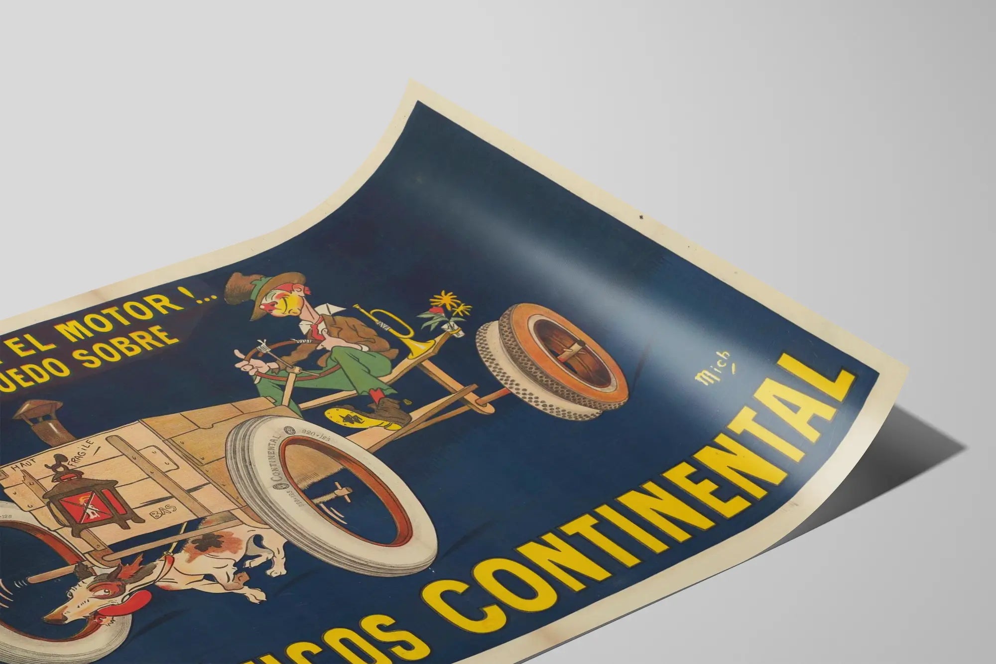 Deze vintage reclameposter benadrukt Continental-banden met een originele en humoristische illustratie. Op een diepe blauwe achtergrond is een karikaturaal personage te zien dat een rudimentair houten voertuig bestuurt, dat beweegt dankzij de Continental-banden, die duidelijk in de verf worden gezet. De Spaanse tekst, "¡Qué importa el motor!... mientras que ruedo sobre Neumáticos Continental", betekent "Het maakt niet uit welke motor ik heb, zolang ik maar rijd op Continental-banden", en onderstreept zo de kwaliteit en betrouwbaarheid van de banden boven de kracht van de motor. Deze charmante en authentieke muurdecoratie roept een tijd op waarin reclamecommunicatie zowel speels als eenvoudig was, perfect voor liefhebbers van retro design en verzamelobjecten. De poster is ondertekend door de kunstenaar "Mich" en voegt een unieke en originele toets toe aan elk interieur, of het nu een woonkamer, kantoor of commerciële ruimte is. Dit decoratieve affiche is ideaal voor autoliefhebbers, verzamelaars van oude affiches of vintage muurdecoratie. Zijn brede formaat zorgt voor een krachtige visuele presentatie, die de aandacht trekt op het humoristische aspect van de scène en de nadruk op Continental-banden. Dit authentieke stuk combineert reclame, grafische kunst en autocultuur in een kleurrijke en dynamische stijl. Een opvallende muurdecoratie vol karakter, gemakkelijk te integreren in een retro of industriële interieurinrichting.