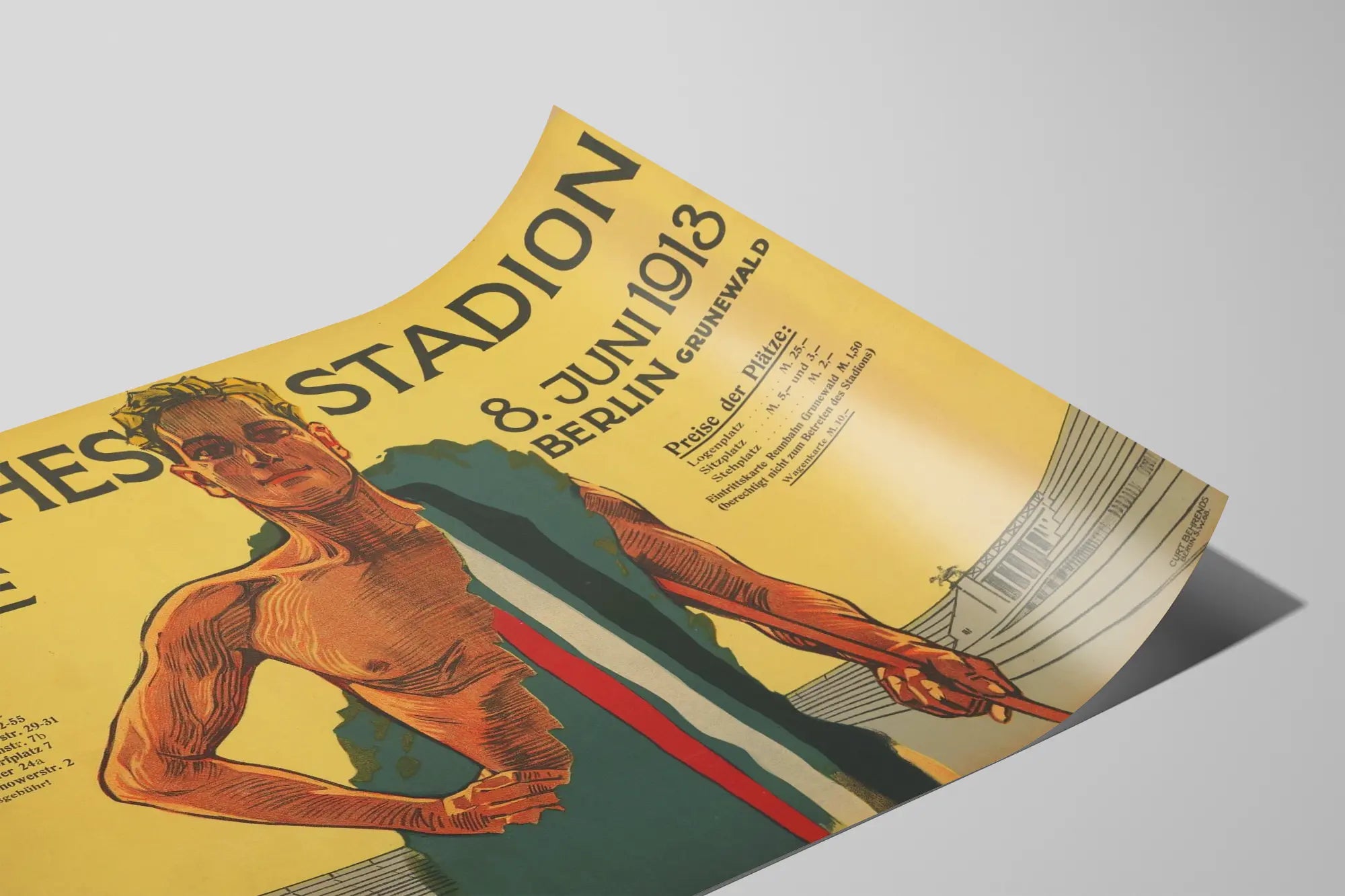 Deze vintage affiche is een geïllustreerde uitnodiging voor het eerste grote herfstsportevenement in het Deutsches Stadion in Berlijn, gedateerd 8 juni 1913. Ze toont een atletische sporter met een blote borst en een driekleurige sjaal, die kracht en vastberadenheid uitstraalt, in een grafische stijl die typisch is voor het begin van de twintigste eeuw. Op de achtergrond schetst de tekening de tribunes van het stadion en architectonische elementen, wat de plechtige sfeer van de wedstrijd versterkt. Deze affiche is ontworpen als een boeiende wanddecoratie, ideaal voor liefhebbers van sportgeschiedenis en retro grafisch ontwerp. Het posterformaat past perfect in een woonkamer, kantoor of sportzaal, en brengt een vleugje dynamiek en vintage design. Het kleurenpalet, gedomineerd door warme, aardse tinten, verrijkt het authentieke karakter van dit unieke stuk. Het gebruik van deze affiche als wanddecoratie brengt de geest van historische sportwedstrijden weer tot leven en versiert een eigentijdse interieur met smaak. Deze poster is een uitstekend schilderij om op te hangen voor liefhebbers van sport, retro kunst en Duitse geschiedenis. Het benadrukt de vintage esthetiek en vertelt een krachtig visueel verhaal dat inspiratie en positieve energie oproept. Perfect om een sportruimte, club of zelfs een privécollectie te verfraaien, deze afbeelding is een mooi eerbetoon aan de geest van de wedstrijden aan het begin van de twintigste eeuw.