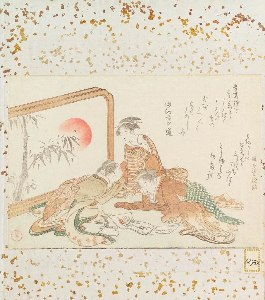Vrouwen die genieten van een surimono van Nieuwjaar - Kubo Shunman