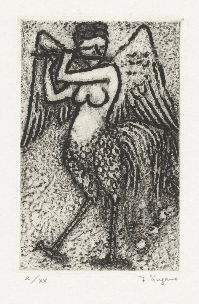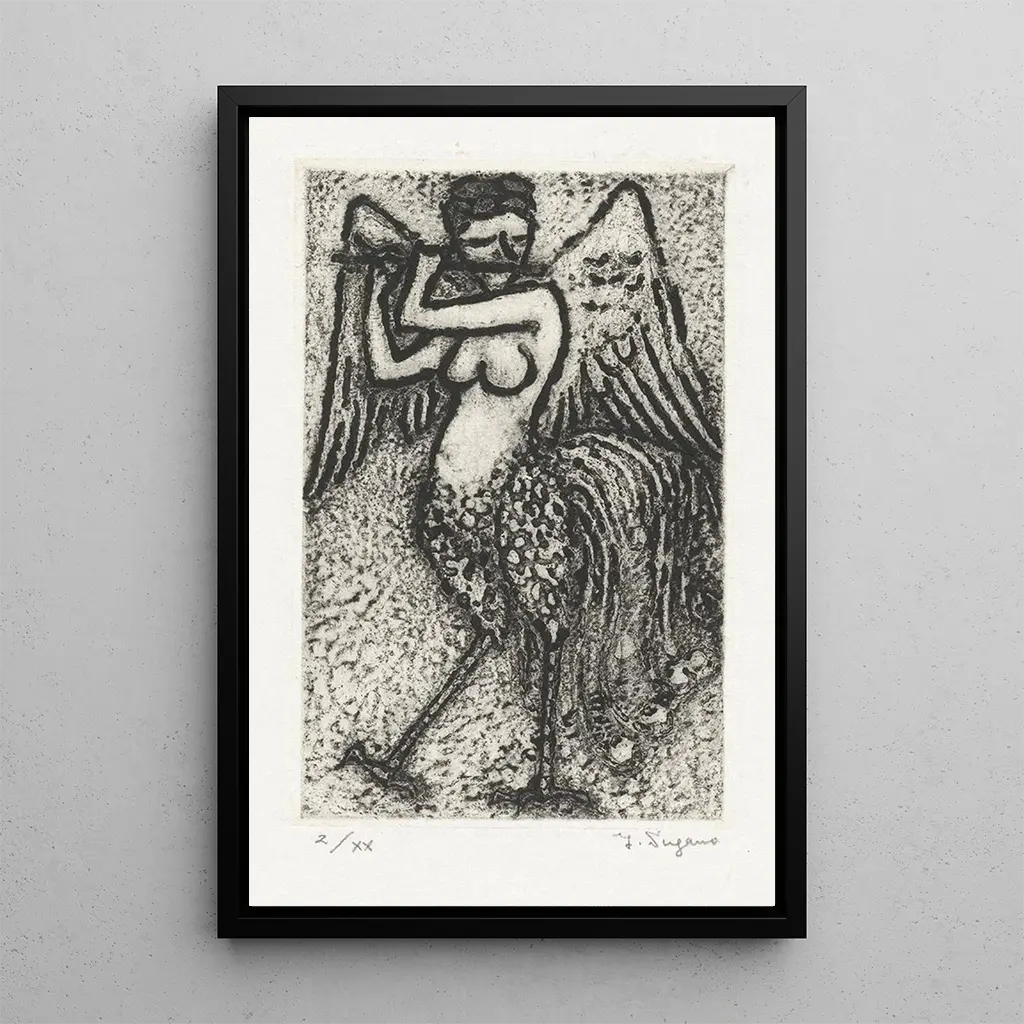 Yo Sugano is een Japanse kunstenaar wiens werk gekenmerkt wordt door een unieke fusie van traditie en moderniteit. Geïnspireerd door de Japanse volkskunst en mythologische verhalen, heeft Sugano een onderscheidende stijl ontwikkeld die hem eigen is. Actief sinds de jaren 2000, weet hij het collectieve verbeeldingsvermogen te vangen door elementen uit de popcultuur te integreren, terwijl hij een poëtische essentie behoudt. Zijn werken, vaak bevolkt door mythologische wezens, nodigen uit tot reflectie over de relatie tussen mens en natuur. "Sirène spelend op de fluit" is een perfect voorbeeld van zijn artistieke benadering, waarbij elk detail een verhaal vertelt.