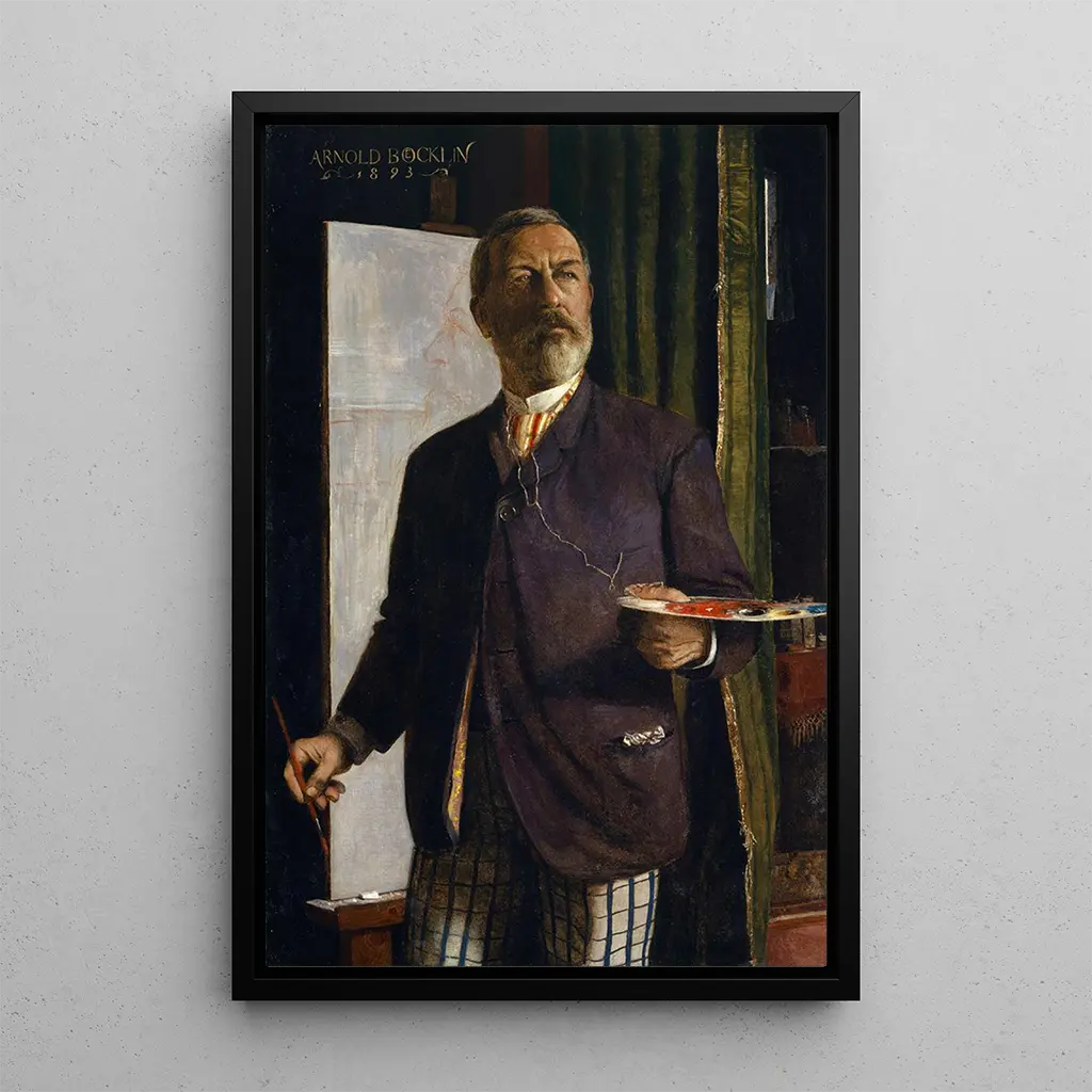 Arnold Böcklin, né en 1827, est souvent considéré comme l'un des précurseurs du symbolisme, un mouvement qui a émergé à la fin du XIXe siècle. Sa carrière a été marquée par une recherche constante de l'harmonie entre la nature et l'imaginaire. Influencé par les paysages suisses et les mythes antiques, Böcklin a su créer des œuvres qui interrogent la condition humaine. L'"Autoportrait dans l'atelier" témoigne de son engagement envers l'art et de son désir de capturer l'essence de sa créativité, tout en offrant un aperçu de son processus artistique.