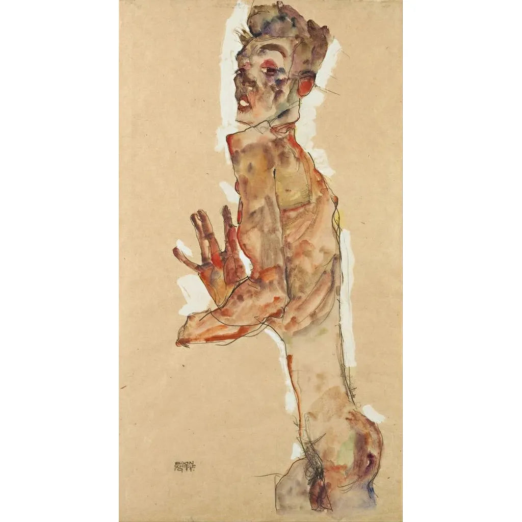 Egon Schiele, né en 1890, est l'un des artistes les plus influents du début du 20e siècle, reconnu pour son rôle central dans le mouvement expressionniste autrichien. Élevé dans un environnement artistique, il a été fortement influencé par Gustav Klimt et le style sécessionniste. Schiele a exploré des thèmes tels que la sexualité, la mort et l'identité à travers ses œuvres, souvent en utilisant des autoportraits pour exprimer ses luttes intérieures. L'Autoportrait aux doigts écartés, réalisé en 1910, illustre parfaitement cette quête d'authenticité et de compréhension de soi.