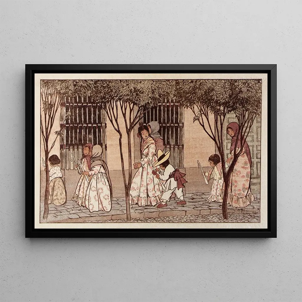 Zondagochtend: een zachte visuele melodie De kunstdruk Zondagochtend van Helen Hyde roept een rustige en intieme scène op, waarin het zachte ochtendlicht de gezichten van de personages streelt. De pastelkleuren, delicaat en rustgevend, creëren een sfeer van sereniteit. De techniek van de kunstenaar, die behendig aquarel en graveerwerk combineert, brengt deze compositie tot leven, waarbij elk detail lijkt te vertellen. De uitdrukkingen van de figuren, verdiept in hun gedachten, nodigen uit tot contemplatie en dromerij, en brengen de kijker mee in een moment dat in de tijd lijkt stil te staan. Helen Hyde: een pionier van de Amerikaanse kunst Helen Hyde, actief aan het einde van de 19e en het begin van de 20e eeuw, is een iconische figuur van de Amerikaanse kunst, beïnvloed door de impressionistische beweging en de Japanse decoratieve kunsten. Geboren in 1868, wist ze de essentie van het dagelijks leven vast te leggen in haar werken, vaak gericht op vrouwen en kinderen. Haar unieke stijl, die verfijning en gevoeligheid combineert, stelde haar in staat zich te onderscheiden in een snel veranderende kunstwereld. De kunstdruk van Zondagochtend getuigt van haar vaardigheid om eenvoudige maar betekenisvolle momenten te weergeven, terwijl ze elementen van Aziatische cultuur in haar praktijk integreert. Een decoratief stuk met vele voordelen De kunstdruk van het schilderij Zondagochtend is een ideale keuze om je interieur te verfraaien, of het nu in een woonkamer, kantoor of slaapkamer is. De kwaliteit van de afdruk en de trouw aan het originele werk garanderen een onmiskenbare esthetische aantrekkingskracht. Dit schilderij brengt een vleugje zachtheid en rust in je decoratie, en creëert een warme en uitnodigende sfeer. Door voor deze doek te kiezen, geef je je ruimte een kunstwerk dat uitnodigt tot reflectie en innerlijke rust, terwijl je je visuele omgeving verrijkt.